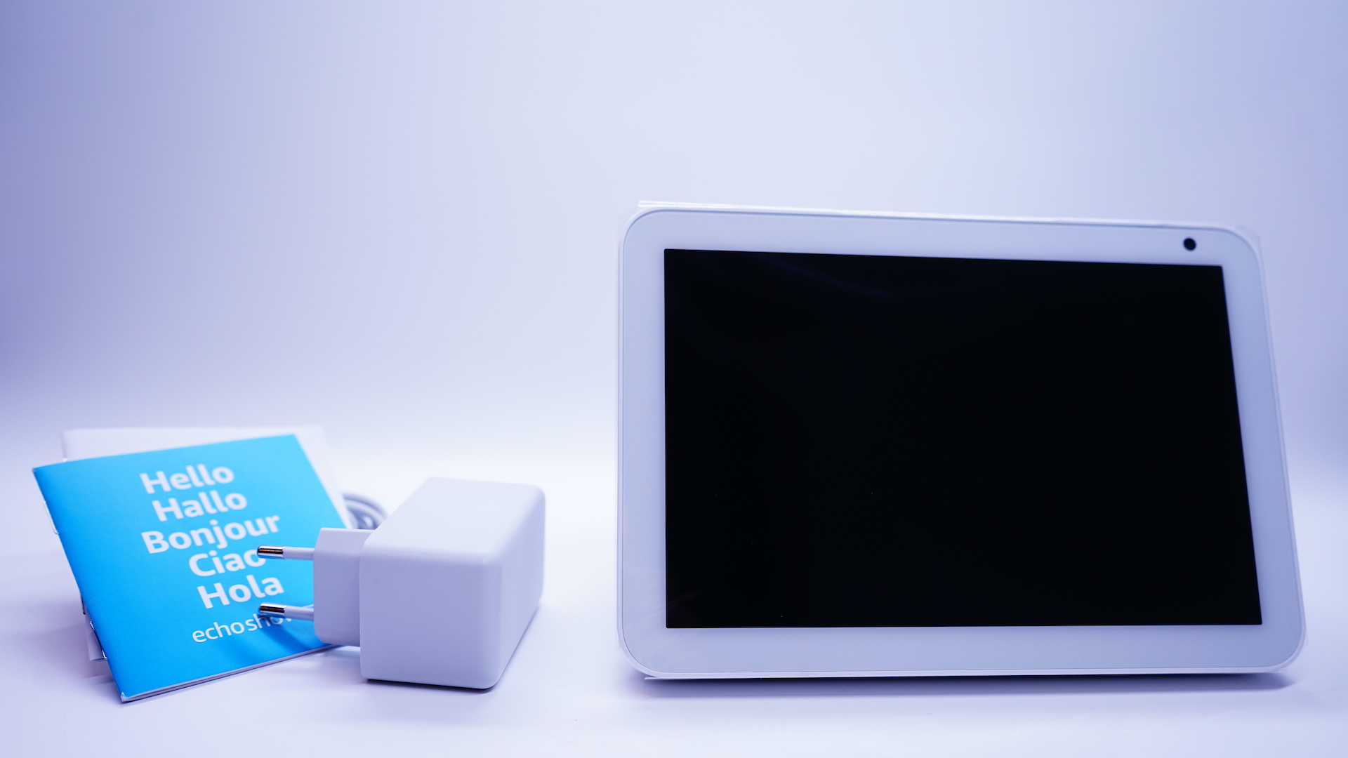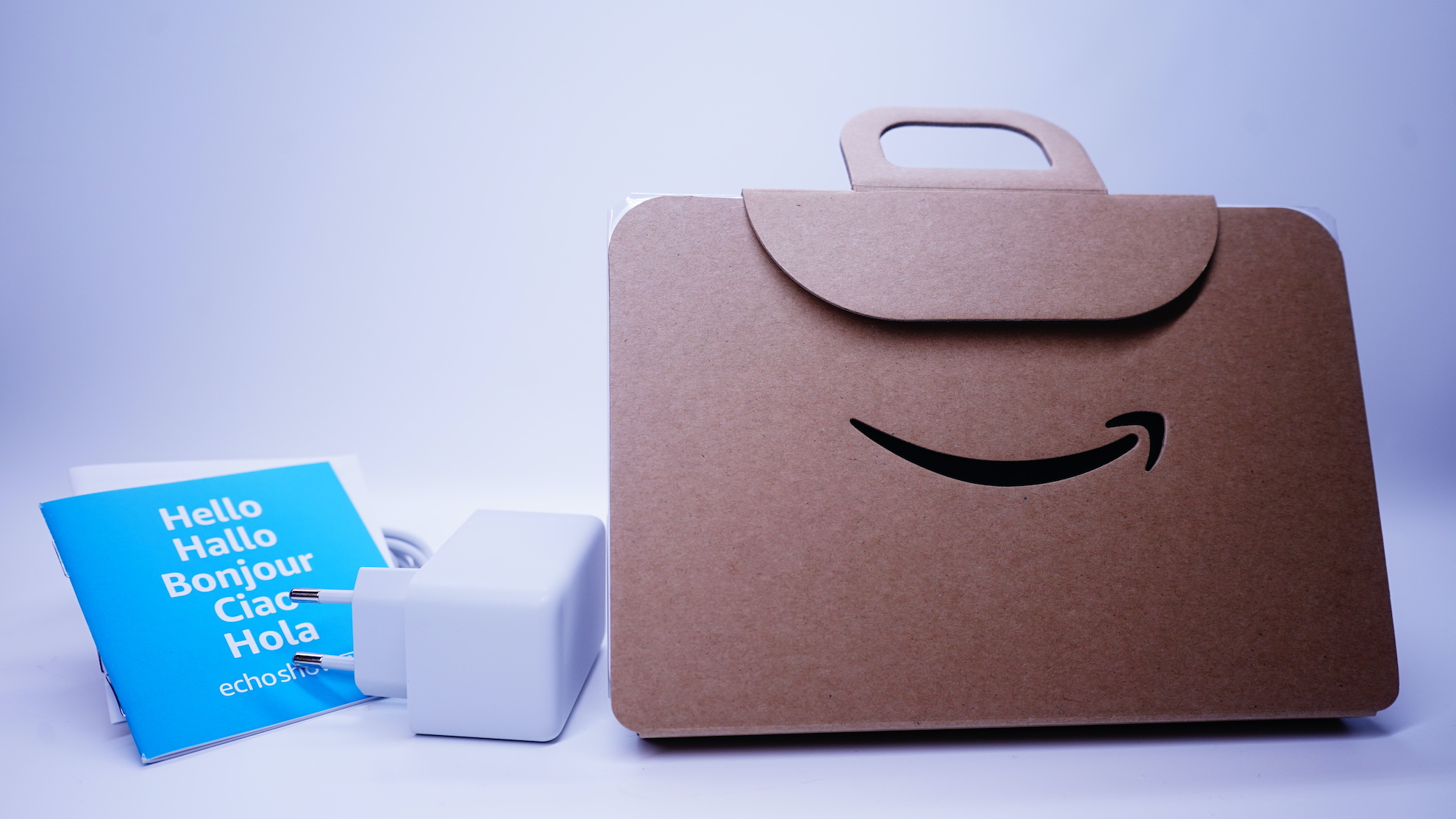 Das Auspacken gekaufter und gelieferter Produkte ist für mich nach wie vor eines der Highlights. Umso schöner ist es, wenn das Produkt originell und stilvoll verpackt ist. Und von Verpackungen versteht Amazon was. Im Lieferumfang des Echo Show 8 enthalten ist das Gerät selbst, ein Netzteil, sowie eine kleine Bedienungsanleitung zur Einrichtung, als auch ein Blatt mit Sicherheitsinformationen. Die Echo Show 8 ist mit einer Schutzfolie versehen und in einen weiteren Karton gehüllt.